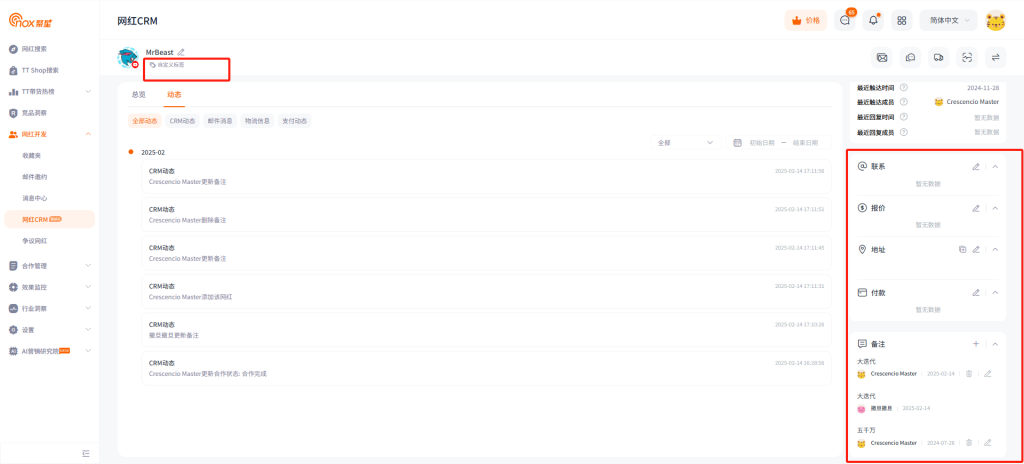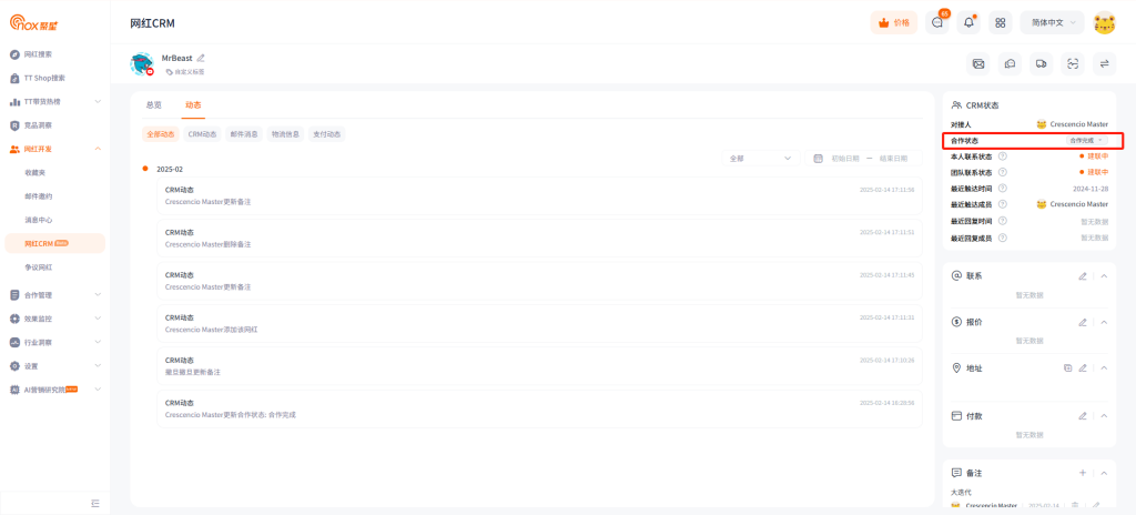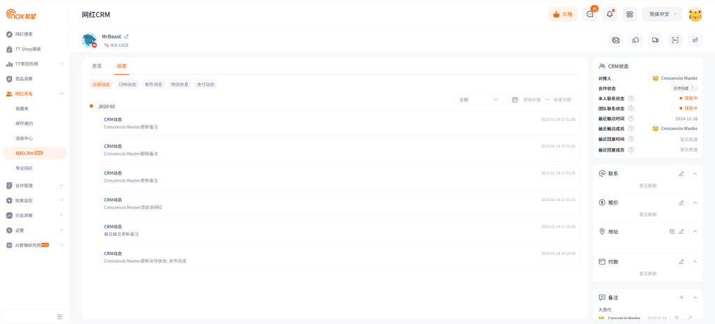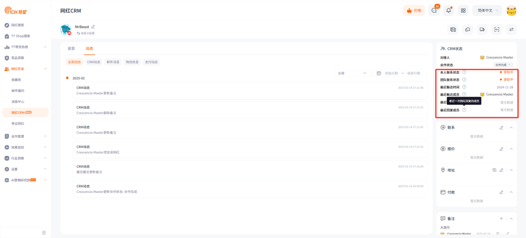 动态中包含对网红进行的各项操作记录展示,分为CRM信息修改的动态、向网红发送邀约邮件的动态、给网红创建物流追踪的动态、给网红创建营销支付单的状态。