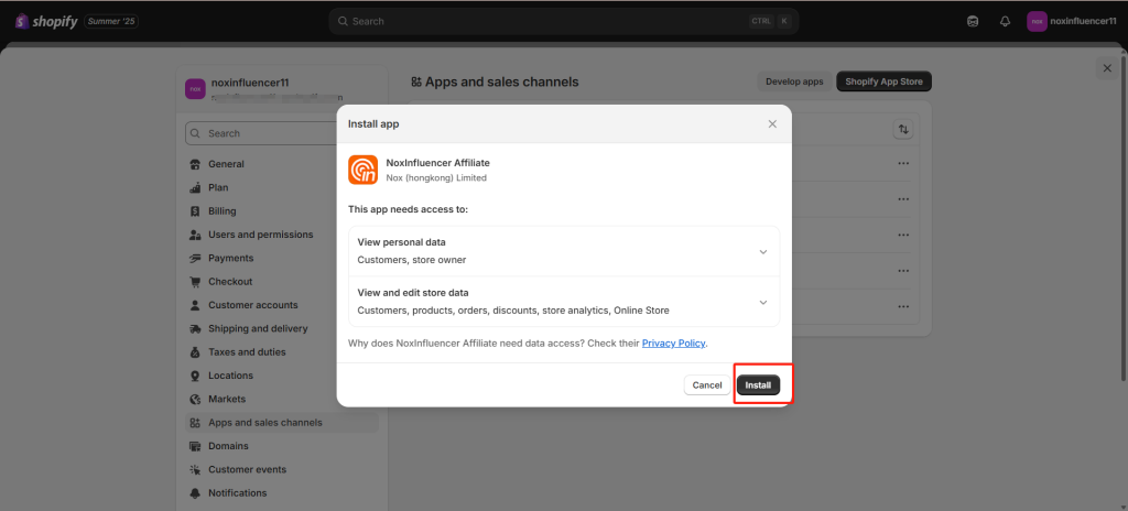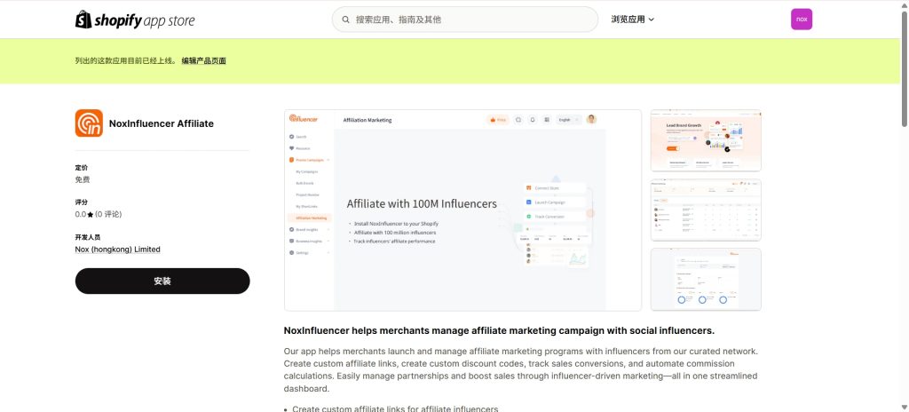 步骤1:访问Nox聚星Shopify插件,NoxInfluencer Affiliate,点击“安装”。
